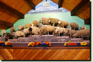 | 一人の男性が現れて、ショー開始。 最初は羊たちの紹介だ。 羊と一言で言っても、実に多彩な種類がある。 その全19種類が見られるのは、ここアグロドームだけらしい。 羊は三角形に組まれたひな壇の上に次々に登っていくが、その最上部にいるのは、メリノという羊。 メリノウールという高級羊毛の代名詞のような言葉を聞いたことのある方も多いと思いますが、メリノウールはこの羊の毛。 さすがに毛の層が厚く、ふかふかしている。 表面こそ汚れて灰色だが中は真っ白。 さすが最高級。 |