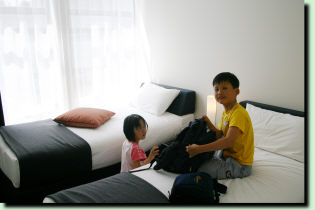 | 鍵となるICカードを受け取って、部屋へ向かう。 部屋へ入ってみると・・。 おお、とてつもなく広いではないですか。 豪華ではないけれど、白と黒が基調の落ち着いたデザイン。 なにより綺麗で清潔感がある。 |
