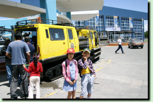 | もう一つの呼び物は、ハグランドライド。 これはハグランドと呼ばれる南極探検用の雪上車に乗って専用コースを走り回るもの。 45度ぐらいの傾斜のある小山を登ったり降りたり、高速ででこぼこ道を走ったり、 優に1m以上の深さのある池に突っ込んでいったり・・。 乗っている人は、簡単なシートベルトと、後はつり革につかまることができるだけ。 坂を上り下りするたびに、激しくあっちへ振られたり、こっちへ振られたり。 立派な絶叫マシンです〜。 池では窓の高さまで水が盛り上がってきます。 なかなかの迫力でおもしろかった〜。 気になるお値段ですが、南極センターとハグランドライドがセットになったファミリー券を買って4人で$90でした。 |