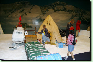 ここの呼び物の一つは南極の気候を体験できる部屋。 日本で言うところの、網走や紋別にある流氷センターの流氷体験室みたいなもの。 -18度の部屋の中に入って南極の雰囲気を感じることが出来る。 防寒服と滑り止めの靴を貸して貰っていざ中へ。 やっぱり寒い〜。 が、ここはそれだけではなかった。 ブリザード体験というものがあったのだ。 時間になると空が徐々に暗くなり、ぐぅぉ〜という効果音とともに風が吹き出す。 本物のブリザードはこんな程度では済まないのだろうが、それでも寒い〜。 とっとと逃げ出す。 |