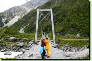 | ミューラーレイクを眺めていると、日本人ガイドに連れられた日本人ハイキングツアーの一行がやって来る。 解説が日本語なので、自然と説明が耳に入ってくる。 この辺りの岩は、削れると非常に細かい白い粒になる。 岩が氷河に削られ、溶け込み、運ばれ、ミューラーレイクで氷河が溶けるとこの岩の粒子のせいで白い色になるのだそうだ。 プカキ湖まで運ばれるれと、白い粒子は底に沈み、あの青色になると。 いやぁ、勉強になりました〜。ツアー代金払わにゃいけませんな〜。 |