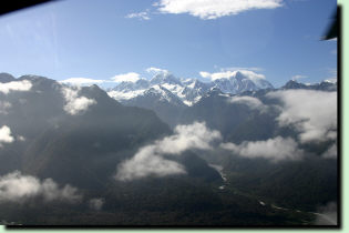 ヘリは一旦海側に進路をとり、続いて大きく180度のターンをし、山へ向かっていく。 最初はフランツジョセフ氷河に向かうようだ。 雲の切れ目から白い雪をかぶった大きな山が見えてくる。 どうやら今日の雲は低いようだ。雲の上に出れば期待できるかも。 |