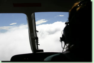 | 前を見ればヘリは雲の上に出ようとしている。 大型の飛行機では前が見えないが、ヘリは進行方向が丸見え。 雲を飛び越えて上に出る感覚は、高揚感というか開放感というか、なんとも言えないいい気持ち。 |