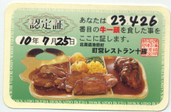 | 食事が終わり、牛一頭を食べたことを証明する通しナンバー付きの「認定証」をもらって今夜のごちそうは終了である。 | |