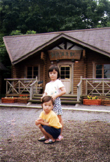 | 起きだしてきた子供達と釧路湿原駅まで散歩することにする。駅まではなだらかな下りの道である。程なく釧路湿原駅に着いたが、周りを見回しても気球の上げられそうな広い場所は見あたらない。どうやら気球はここではないらしい。風情のある丸太づくりの駅舎を背景に記念撮影した後車に戻ることにする。 | |