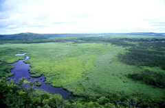 | 本当にゆっくり上がるから、加速度なんて全然感じられない。目をつぶっていれば上がっていることなんか分からないんじゃないだろうか。目の前に釧路湿原の景色が広がってきた。霧はすっかり晴れて、湿原の向こう側の山裾まで見えている。広い。とてつもなく広い。広大な緑の絨毯が見渡す限り広がっている。手前にはその緑の絨毯の間を釧路川がうねうねと流れている。ビデオや写真ではこの広さはきっと実感できないだろう(といってもきっちりビデオはとっていたが) | |