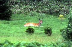 名残惜しいが車をスタートさせる。しばらく車を進め、とあるカーブにさしかかったその時、目の前を親鹿2頭と、子鹿2頭が急に道路にとびだして横切っていった。びっくりしてブレーキを踏む。幸いスピードを出していなかったので鹿達をはねずに済んだ。 「最近鹿がはねられる事故が増えている」と書いてあった記事を読んだことがあったが、なるほどと納得させられる出来事であった。その後も斜面の花畑で草を食べている鹿を目撃するなど、最後は鹿づくしであった。 |